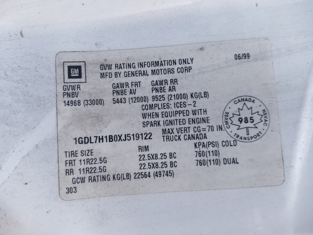 Truck VIN 1GDL7H1B0XJ519122